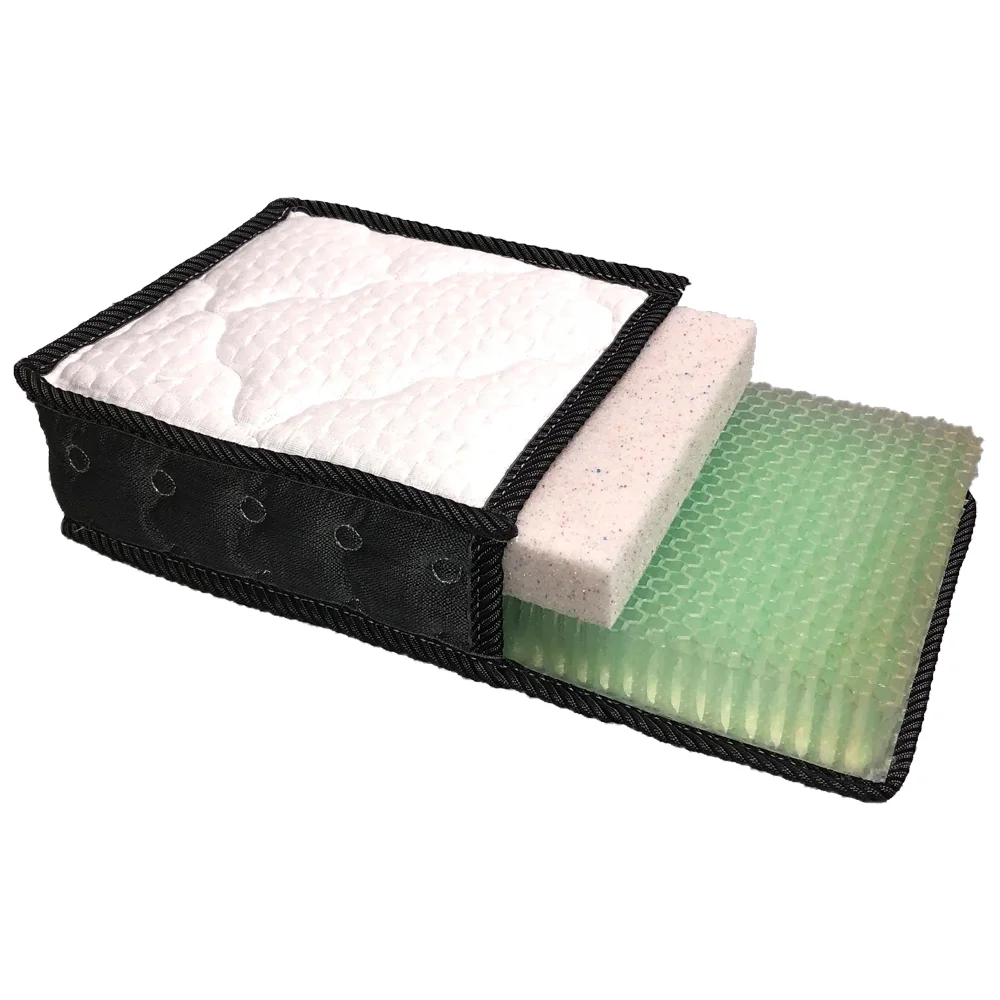 Each of our mattresses is available in a 4-inch or 5-inch option, available in latex or gel, constructed with a Honeycomb Gel Supracor base,, micro pocket coils, a cool-touch quilted cashmere cover OR 1.5″ gel memory foam comfort layer, and no-feel dual-hinge fold design.
